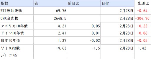 2/24 月曜 【いろいろニュース、米バークシャー、24年は3年連続最高益 日本の商社株保有拡大も、「SHOGUN」が4冠、全米映画俳優組合賞 日本人受賞は初、ロシア、長期的なウクライナ和平望むと表明 米の早期停戦案に懸念、マスク氏、政府職員に成果報告要請 複数機関が返信拒否を指示、ウクライナ侵攻3年、支援に感謝とゼレンスキー氏 状況は厳しく、ローマ教皇、「よく眠り安静」と教皇庁 重篤な状態続く、ミャンマー詐欺拠点から7000人救出、タイ当局受け入れ遅れ 国境で立ち往生、、】2/25 火曜 【いろいろニュース、米スタバ、管理部門で1100人削減へ 事業効率化狙う、ヘッジファンド、ハイテク株の売り加速=ゴールドマン・サックス、インフレ・雇用巡りFRBの強力な対応期待高まる=SF連銀調査、NY外為市場=ユーロ上げ幅縮小、独選挙後の連立協議難航を懸念、米国株式市場=ナスダック1%超安、AI巡る警戒感で エヌビディア決算に注目、午後3時のドルは149円半ば、2カ月半ぶり安値圏で下げ渋り、、NY市場サマリー(24日)ナスダック1%超安、ユーロ上げ幅縮小・利回り低下、マイクロソフトにデータセンターのリース解約情報、AIブームに疑念、米バークシャー株が最高値更新、好決算受け、ペルー、今年は4%成長に インフレ率2%前後で安定=経済財政相、米FRB、利下げ再開にはより明確な情報必要=シカゴ連銀総裁、独VWと中国CATL、リチウム電池開発で協業、BMW、英国でBEV「ミニ」の生産開始時期を見直し、企業向けサービス価格、1月は3.1%上昇 外航貨物や宿泊が押し上げ、米ブラックロック、欧州株投資評価を引き上げ、ドイツの1月税収は前年比8.9%増、先行指標は厳しい景況反映、JPモルガン幹部、出社義務化巡り従業員に「もっと努力を」、トランプ政権、日蘭に対中半導体規制強化で圧力=ブルームバーグ、印IT業界の売上高、25年度は5%増に加速へ=業界団体、タイ自動車生産、1月は前年比-24% 18カ月連続減=業界団体、日経平均は大幅反落、一時600円超安 ハイテク株安が重し、日鉄社長「出資と設備投資は切り離せず」、USスチール買収巡り、東京マーケット・サマリー・最終(25日)、トヨタ、監査等委員会設置会社に 岡本元財務次官を社外取に起用、対米輸出急減も、関税で二国間貿易に打撃=中国人民銀顧問、テスラ、中国でオートパイロット更新 期待外れの声も、ANA、航空機77機を2兆円超で発注 エンブラエル製小型機も、アングル:日本株にリバランス売り警戒、国内金利高で株安でも比率上昇、1月全国百貨店売上高5.2%増、インバウンドけん引し3カ月連続プラス、ビットコイン、1カ月ぶり9万ドル割れ イーサも急落、1月ショッピングセンター売上高は前年比4.9%=日本SC協会、ヘッジファンド、アジア株買い意欲が16年以降で最高=ゴールドマン、ロシア、ウクライナへの欧州平和維持部隊派遣に改めて反対 米の姿勢評価、ウクライナ経済再建費用、推定5240億ドル 世銀など試算、自公維が予算修正で正式合意、年度内成立へ道筋 「重い判断」と前原氏、、】2/26 水曜 【いろいろニュース、米経済の実態は「ぜい弱」、政権は経済「再民営化」目指す=財務長官、米2月CB消費者信頼感98.3に急低下、関税懸念で物価見通し上昇、米住宅価格指数、24年12月は前月比0.4%上昇=FHFA、BofAのCEO、FRBの年内金利据え置きを予想、米国株式市場=S&P・ナスダック一時1カ月ぶり安値、景気不透明感でリスクオフ、NY外為市場=ドル下落、軟調な消費者信頼感受け、NY市場サマリー(25日)S&P・ナスダック一時1カ月ぶり安値、ドル下落、利回り急低下、午後3時のドルは149円半ばへ反発、米金利の低下一服、日経平均は続落、米景気不透明感を嫌気 エヌビディア決算先取りも、米下院のFRB監督特別委、金融政策運営を幅広く検証へ、世界の債務残高、昨年末318兆ドルで過去最大 対GDP比4年ぶり上昇=IIF、英首相、27年までに防衛費2.5%に増額表明 トランプ氏との会談に先手、自公維が予算修正で正式合意、年度内成立へ道筋 「重い判断」と前原氏、イスラエル、第1段階ガザ停戦合意延長を検討 恒久的停戦には溝深く、USスチール・日鉄、買収「救済」へ最後の努力 米高官との会談模索=報道、ウクライナ大統領、28日訪米 鉱物協定署名へ=トランプ氏、米国債の中央清算促す新規則、SECが完全実施を1年延期、テスラ時価総額1兆ドル割れ、欧州販売急減で マスク氏巡る懸念も、ゆうちょ銀「上乗せ規制」緩和へ、郵政が保有株6000億円規模売却=関係者、米EVルーシッド、CEOが退任 今年の生産台数は2倍超を予想、韓国出生率、24年は9年ぶり上昇 0.75に 婚姻数15%増、ホワイトハウス、大統領の取材参加者を選定へ 報道の独立性に懸念も、ウクライナ大統領、28日訪米 鉱物協定署名へ=トランプ氏、米銀利益、昨年第4四半期は2.3%増 利下げ効果や引当金減少で、米マクドナルド、卵に追加料金なし・アプリ値引き 顧客獲得狙い、基調的インフレ指標、1月は刈込平均の伸び率2%台に拡大=日銀、改定景気動向指数、12月一致指数は前月比+1.0ポイント=内閣府、株式売り出し実施の有